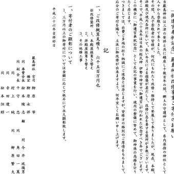 「御遷宮記念」嚴島神社改修事業ですが、来年の2月から拝殿屋根葺き替え工事を行うことが決定致しました。今年度を目途に寄付を募り、2月から改修を始め、秋祭りには完成する予定です。拝殿は銅板の本葺きに葺き替える予定です。イメージ↓ですので、瓦屋... -