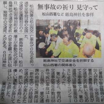 春の全国交通安全運動(6~15日)初日となる4月6日愛媛県警松山西署と松山西交通安全協会による交通安全祈願が行われました。当嚴島神社は、江戸時代には松山藩主が参勤交代で江戸に行く際にお参りされ、その道中の安全、藩内の平和を祈願されていた... -