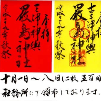 昨年、好評いただいた">秋祭り特別御朱印今年も行います。10月1日~8日の機関の限定です。古三津南の黄三津北の赤をイメージした台紙に書いています。お祭りを見に来られた方はどうぞお受けください。 -