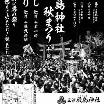 今年の秋祭りも例年通り曜日に関係なく10月5,6,7日に行います!十月五日 午後9時頃 宵宮神輿上納(よいみやしんよじょうのう)(けんか神輿あり) 六日 午後7時 子供神輿宮出し 子供とら舞奉納 七日 午前0時半頃 とら舞奉納... -