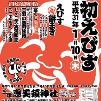 三津 恵美須神社(松山市三津2丁目7-34)にて1月10日木曜日に初えびす祭執り行います。午前11時、午後2時、午後4時半~恒例の餅まき甘酒の無料接待富くじ平成船手組によるじゃこ天実演も執り行います。三津恵美須神社では1月10日 初えびす7... -