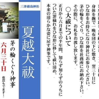 毎年6月30日に行われる夏越の大祓それに先駆けて、氏子の皆様にひな形を頒布しています。6月4~11日の間自転車にてご自宅に頒布しに参ります。一軒一軒回っていますので、行けないところもございますので、ご了承ください。今年は道路の工事が多い... -