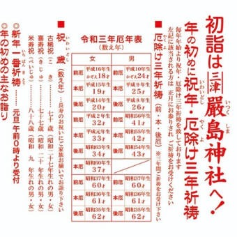 早いもので今年もあと9日となり来年の厄年についての問い合わせも増えてきました。 問い合わせが増えてきました「厄除け三年祈祷」について説明を致します。本厄に該当する方は男性が25、42、61歳女性が19、33、37、61歳の方です。厄年の方... -