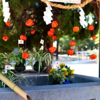 今回のフラワーショップ小谷さんによる花手水はガラリと雰囲気が変わりました。ビクトリーブーケと涼しそうに見えるように、苔玉にアイビー・バギラ・オリヅルラン・リリーグラス・カボックそしてホオヅキが浮かび、日本の国旗とのコントラストが綺麗です... -