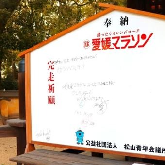 令和4年1月30日(日)に開催される愛媛マラソンへの願い事や応援メッセージを自由にお書きできる特大絵馬を設置しました。この絵馬は松山青年会議所より奉納されたもので今年の愛媛マラソンは開催中止になったので設置しませんでしたが、来年は開催され... -