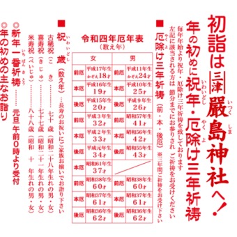 早いもので大晦日を迎えました。今年も皆様方に支えていただき、大変お世話になりました。誠にありがとうございました。大変遅くなりましたが、来年の厄年についてご案内いたします。本厄に該当する方は男性が25、42、61歳女性が19、33、37、... -