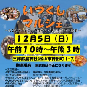 本日は時折雨が降ったかと思えば、陽が出て、地震や雷もあり、不思議な天気でした。さて、12月5日(日)10時~15時三津嚴島神社(愛媛県松山市神田町1-7)にて【いつくしマルシェ】を開催します!オーガニックマーケットと手作り雑貨市が一緒になった【... -