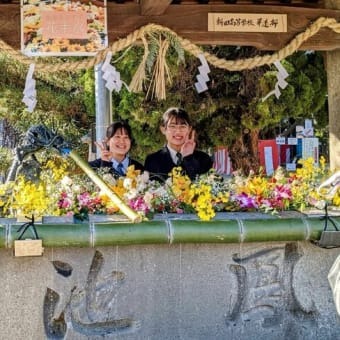 昨年に引き続き新田高校華道部の生徒が花手水を奉納されました。誠にありがとうございます。始業式が終わり、三津嚴島神社に集合した生徒たち昨年はセンリョウ、マンリョウ、椿、梅など正月らしいお花が多かったですが今年はランやカスミソウなど黄色と白... -