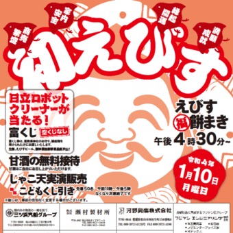 令和4年1月10日(月)兼務社である恵美須神社(松山市三津2丁目7-34)にて初えびす祭執り行います。今年の初えびすは新型コロナウイルス対策をしながらも例年行っていた甘酒の無料接待、出店、じゃこ天実演販売は行います。餅まきは16時半~の一回の... -
