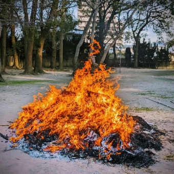 正月にお預かりした古い御札やお守りをお焚き上げしました。今まで見守っていただいたことに感謝をして奉仕致しました。古い御札やお守りについては今後も承りますので、拝殿向かって右側の納めどころに入れていただきますとお焚き上げ致します。 -