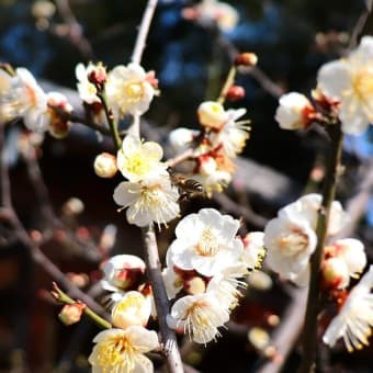 境内の梅の花が開花して、甘い香りに誘われてミツバチが遊びに来ていました。三津天満宮に祀られている菅原道真公は梅の花と縁が深く、様々なお話が残っています。道真公は藤原氏の陰謀により九州大宰府に左遷されました。故郷である都を離れる日、幼い頃... -
