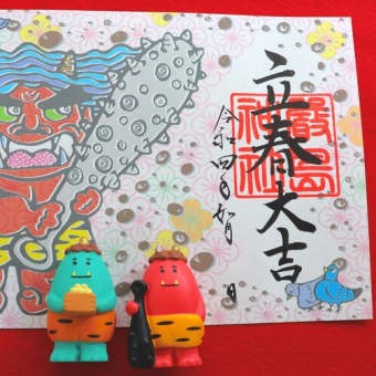 1月から始まった【クリエイター応援企画】2月の御朱印は楠香奈子さんにデザインをお願いしました。節分をイメージして豆を撒かれる鬼と、神社にたくさん集まる平和の象徴である鳩が豆を食べている構図です。2月らしく、鬼の体と背景は梅をモチーフに、ス... -