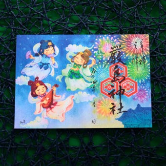 葉月(8月)の限定御朱印は当社でお祀りしている宗像三女神と花火をモチーフに致しました。母恵夢のCMのイラストも手掛けられたわたなべ大さんにデザインしていただきました。三津の花火を眺めながら夏の夜空を3人の女神が歌って踊って祝福をしながら飛ん... -