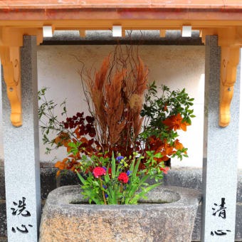 天満宮花手水にフラワーショップ小谷さんがお花を活けてくれました。屋根がついたばかりの手水舎にいつも以上に豪華に飾りつけしてくれました。誠にありがとうございます。 -