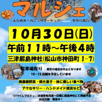 10月30日(日)に三津浜で様々な催しが行われます。どうぞ遊びに来てください!「いつくしマルシェ」日程:10月30日(日)時間:11:00~16:00場所:三津嚴島神社「いつくしマルシェ」はオーガニックマーケットと手作り雑貨市が合わさったものです。屋外... -