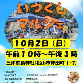 10月2日(日)10時~15時三津嚴島神社にて えひめオーガニックマーケットと手作り雑貨市が合わさった「いつくしマルシェ」屋外でのんびり行っていますので、どうぞ遊びに来てください!ー出店店舗ー・Vegeフルや 旬の生鮮食品・ぜんざい・筍... -