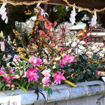 草月流の花手水のお花が開花し、見頃を迎えています。珍しい八重の百合かわいいピンクの木瓜の花いい匂いのロウバイ綺麗な花たちを見ていると明日も良いことがありそうな予感🏵 -