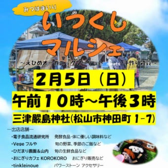 オーガニックマーケットと手作り雑貨市が合体した「いつくしマルシェ」を開催します! 『みつはまいり』と題して、徐々に第一日曜に三津浜でイベントが行われるように頑張っています。寒い中ですが、屋外でまったり行いますので、是非遊びに来てくだ...