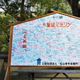2月12日(日)に3年ぶりに開催される愛媛マラソン!ランナーを応援する絵馬にはメッセージがびっしり! 皆様の願い事が叶いますように。 ※2月12日には裏返して御礼メッセージを書けるようにします。 -