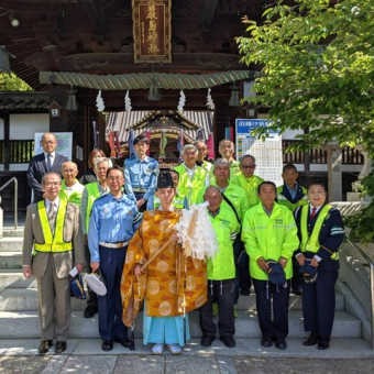当社の御祭神は道の神様としても知られており、毎年、愛媛県松山西交通安全協会による交通安全祈願祭をしております。参列者の後に車のお祓いも行い、皆様の道中の安全を祈念いたしました。 -