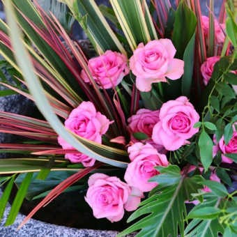 フラワーショップ小谷さんより奉納いただいている天満宮花手水。境内にある三津天満宮の門の前にある手水舎のお花が入れ替わりました。ピンクのお花が美しく、吸い込まれるようです。いつもありがとうございます。 -