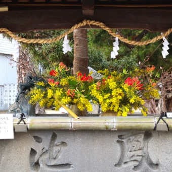 これからさらに見ごろになるミモザ、ハナモモ、ネコヤナギ色鮮やかなお花がとても春らしくて綺麗です!本日2月17日の祈年祭に合わせて神門のところにお飾りさせてもらいました。祈年祭は五穀豊穣を祈るお祭りになります。誠にありがとうございます。 -