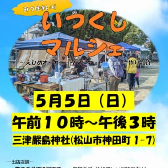 5月5日いい天気となった松山。「いつくしマルシェ」を開催します!体に優しい食べ物と手作り雑貨のお店が集まり、三津嚴島神社の境内にて、こぢんまり行っています。【いつくしマルシェ】5月5日(日)午前10時~午後3時三津嚴島神社(愛媛県松山市神田町1-...