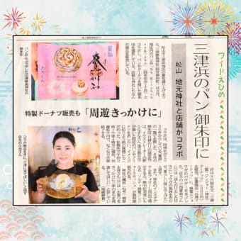 夏詣の御朱印は「三津浜応援企画」と題し、三津の美味しいものをモチーフにして御朱印をきっかけに三津の町を楽しんでいただけるように致しました。8月は『BAKE CAFE N's Kitchen & labo』のパンをモチーフにしています。店舗の方でもコラボパンの「... -