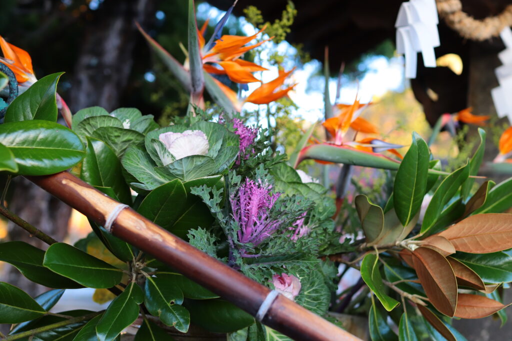 【草月流】師走の花手水に入れ替わりました。華道・草月流の先生が師走の花手水に入れ替えてくれました。 早くも年末、葉牡丹(ハボタン)や艶やかな葉の間から鳥のようなストレチアが印象的な花手水が完成しました。葉牡丹(ハボタン)の花言葉は、「祝福」「愛を包む」。 花材紹介 ・青文字 枝分か...