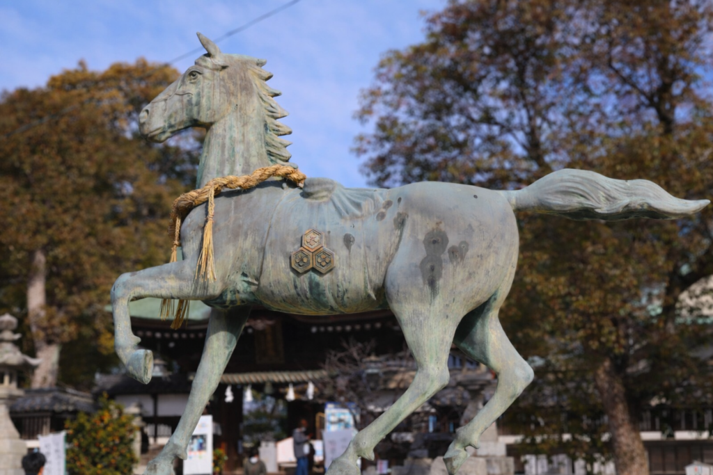 境内の御神馬の銅像は、願いを神さまへ届ける存在として、今も静かにその役目を担っています。