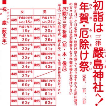 厄年の前年が前厄(まえやく)、次の年が後厄(あとやく)となります。該当の方は1年間が厄年になりますので、年初め(2月3日節分まで)に厄祓いされることをすすめします。