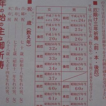 厄年(やくどし)にあたる方は男性が25、42、61歳、女性が19、33、37、61歳の方です。