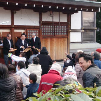 雪が降ったこともあり、足元がぬかるんでしまいましたので、1、2回目の餅まきは直接手渡しとなりましたが、