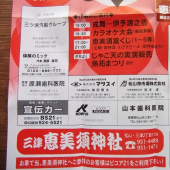 7月10日 恵美須神社 夏えびす祭 2013 7/10 兼務社祭典 2013年7月10日 7月10日恵美須神社(愛媛県松山市三津2丁目7-34)にて夏えびす祭が行われます。 昨年は鯛(たい)のはく製の奉納があり、市長もお参りに来てくれました。以下昨年の画像をアップしておきます。 恒例の餅まき、カラオケ大会や夜店も出ますので、皆様お誘いあわせの上、お参りください。 兼務社祭典 石鎚神社 夏山開き大祭奉仕 御礼 夏恵美須祭