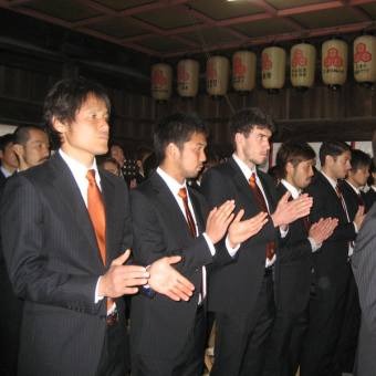 サポーターの声援に迎えられ、当厳島神社の拝殿にて祭典を執り行いました。