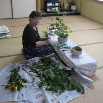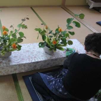 6月の香川ひろこさんによる献花の花材はトサミズキ、バラ、ドラセナです。