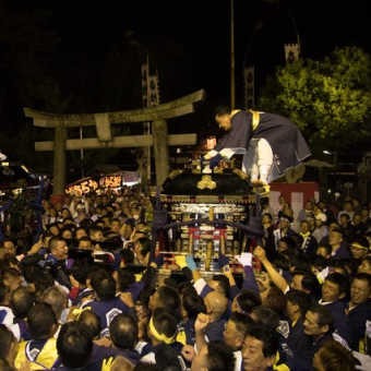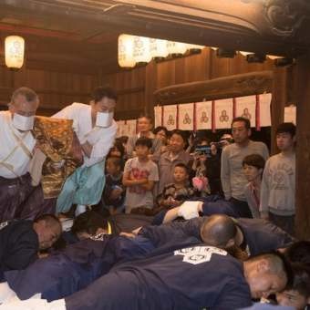 宮入では多くのお参りの方の前で鉢合わせ(けんか神輿)を行い