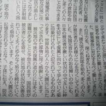 この度の大震災に当たっては、国や地方公共団体の関係者や、多くのボランティアが被災地へ足を踏み入れ、被災者のためにさまざまな支援活動を行ってきました。このような活動は厳しい避難生活の中で、避難者の心を和ませ、未来へ向かう気持ちを引き立ててきたことと思います。この機会に、被災者や被災地のために働いてきた人々、また、原発事故に対応するべく働いてきた人々の尽力を、深くねぎらいたく思います。