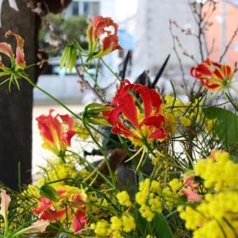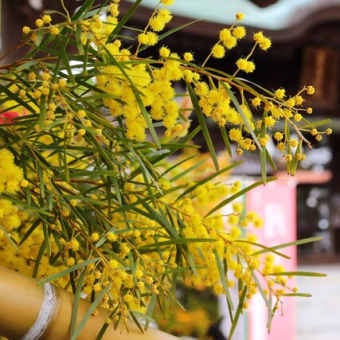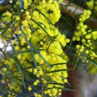 ミモザの一種で葉が細いブリスベンの黄色いポンポンしたふわふわの球体が風に揺れるとまるで蝶々が飛んでいるようです。