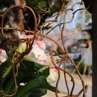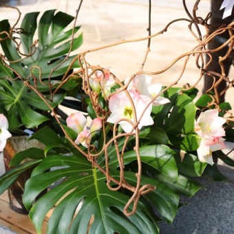 生け込みの時は、ぐっと硬い蕾のアマリリスでしたが、徐々に咲いてゆくことで山が笑っている風景を表現しています。
