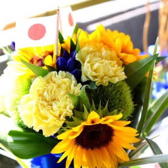ヒマワリ、リンドウ、カーネーション、ハラン、てまり草、胡蝶蘭が使われています。
