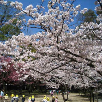 只今、見頃を向かえている境内のサクラ。本日は園児達がサクラを見ながら遊んでいました。