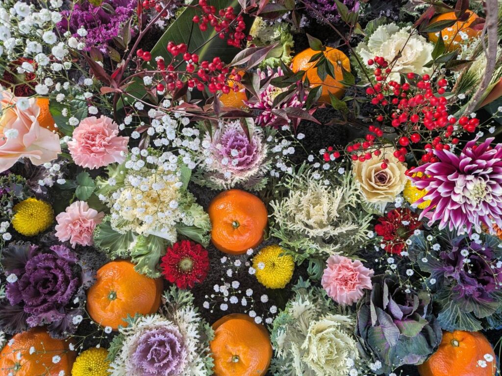 葉ボタン(祝福)、バラ、菊、ピンポンマム、カーネーション、ガーベラ、かすみ草、伊予ミズキなど、計12種類の草花を使用。