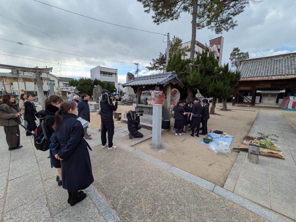 1月8日、松山北高校中島分校 茶華道部の生徒7名が、神社の手水鉢に花を生け、「花手水」を制作しました。