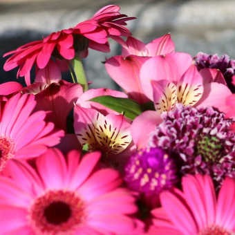 ガーベラ、シキミヤ、アルストロメリア、スカビオサ、ドラセナ