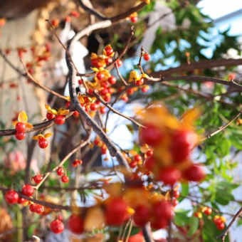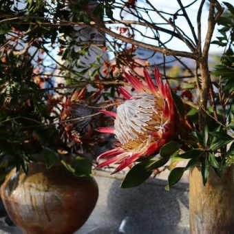 異国風の魅力あるプロテアは華やかで咲くと大きく広がります。プロテアを傘、そして、つるうめもどきで流れる秋風を表現しています。現在はプロテアがユリに替わっています。