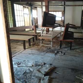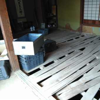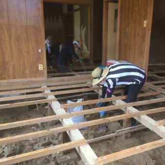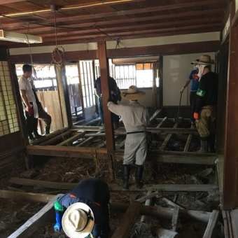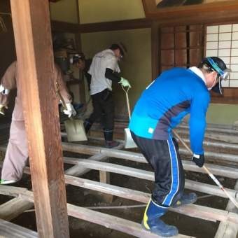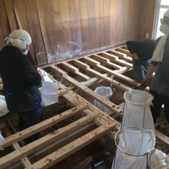 旧宮司宅は取り壊し予定ですが、浸水したので、床板をはがし、不要な木材はチェーンソーで切り取り、泥を取り除きました。