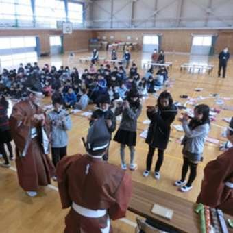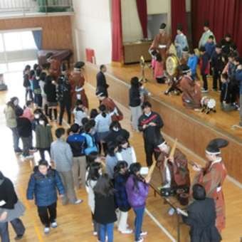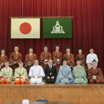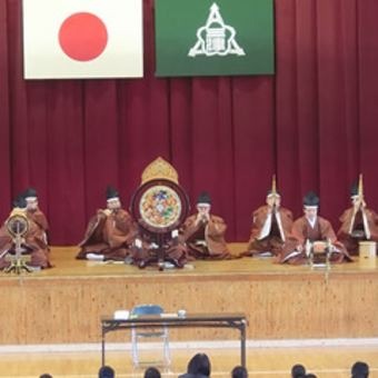 4~6年生114名と保護者の前に音楽の教科書にも掲載されている海松色(みるいろ)の直垂(したたれ)に身を包んだ同青年会会員達がそろうと、