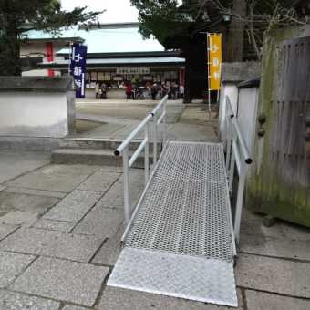当嚴島神社(いつくしまじんじゃ)では車イスの方も参拝できるよう階段にスロープ・手すりを付けております。