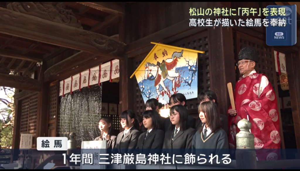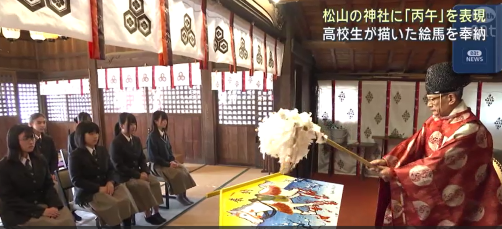 松山西中等教育学校美術部の生徒の皆さんより、来年の干支絵馬となる大絵馬をご奉納いただきました。